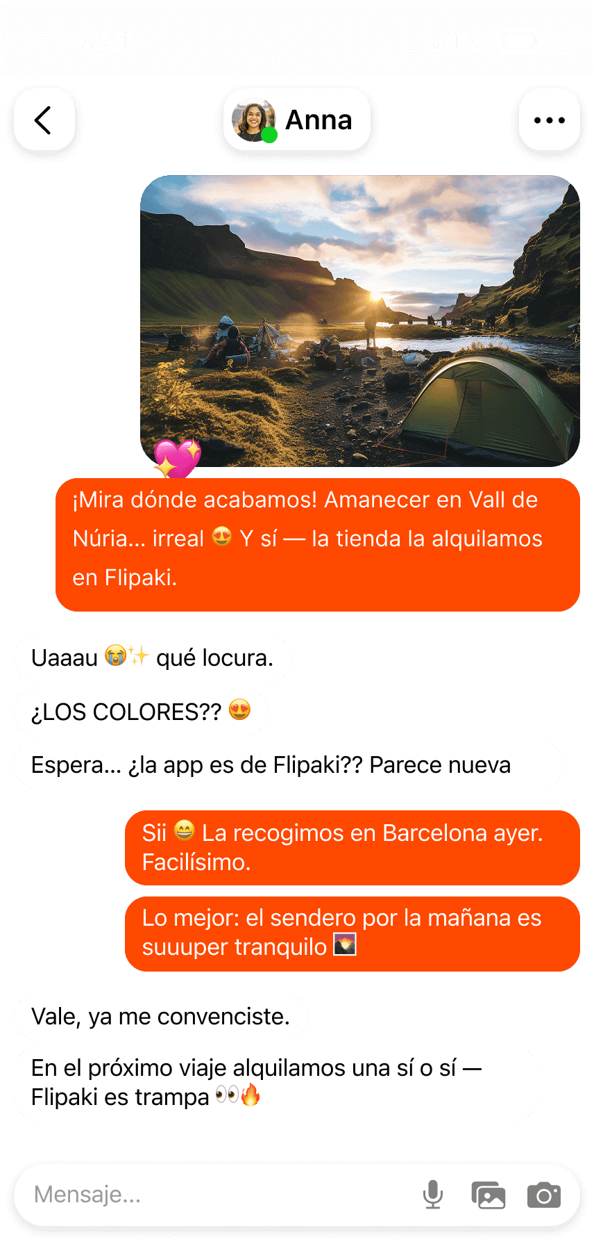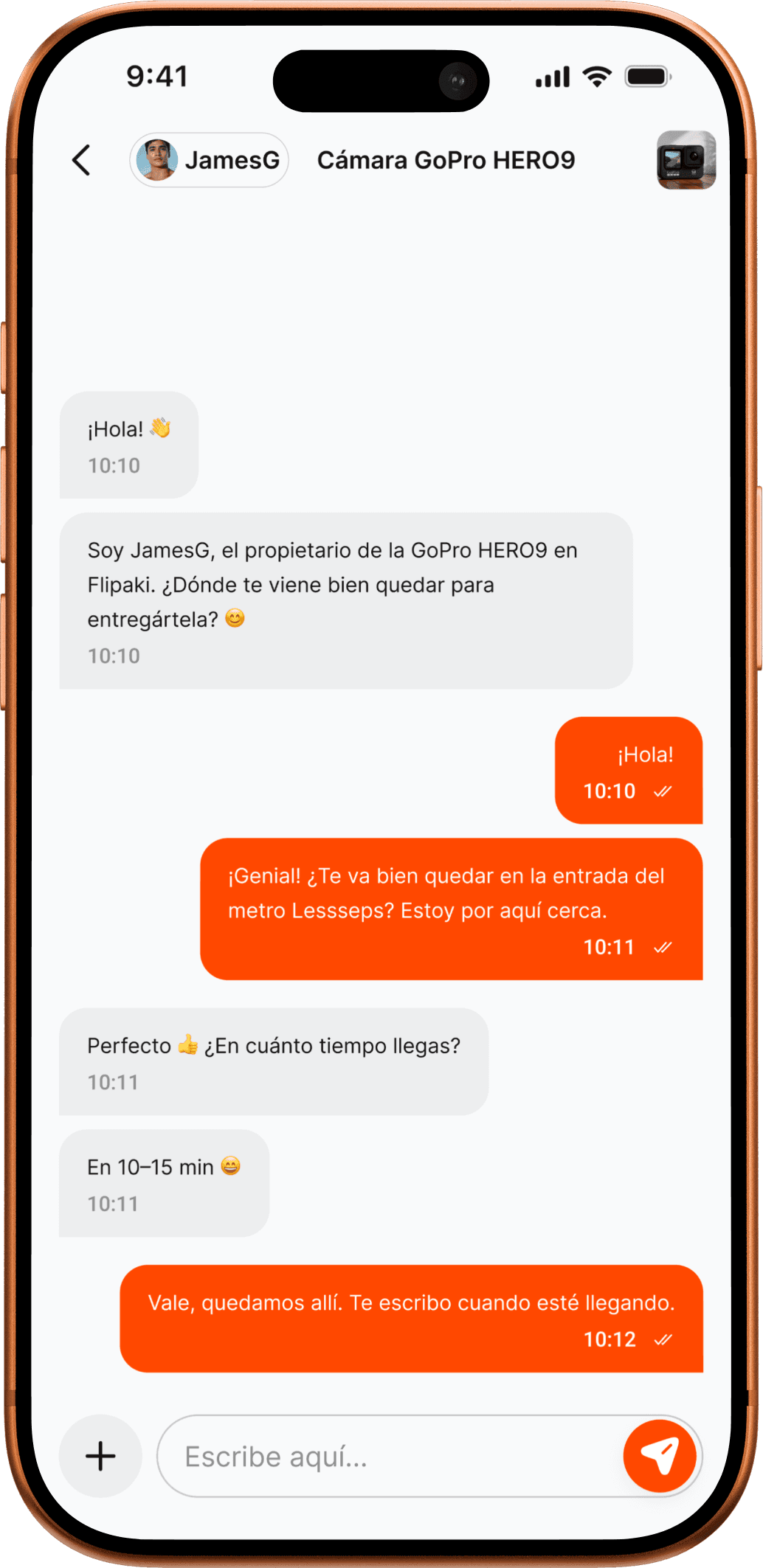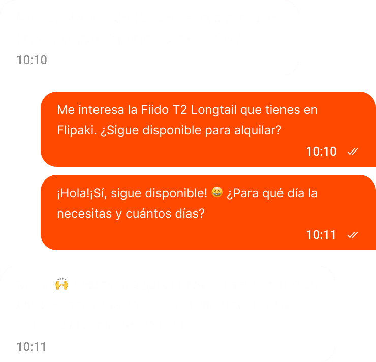 Con Flipaki, cada solicitud de alquiler llega directamente a tu bandeja de entrada. Puedes comunicarte al instante con tus clientes, confirmar detalles y mantener un registro escrito de todos los mensajes. Cada conversación está cifrada para garantizar la privacidad y puedes adjuntar fotos, detalles de entrega o confirmaciones de depósito. Una comunicación clara y directa significa menos confusión y más confianza entre tú y tus clientes.